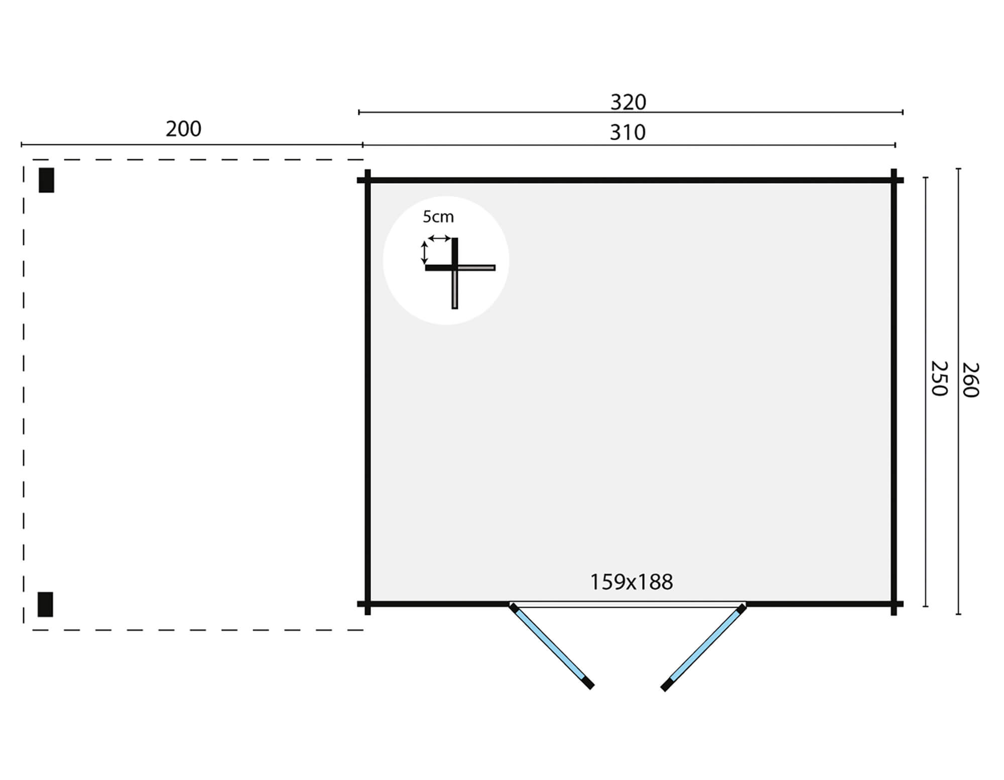 Grundriss 310 x 250 cm Firsthöhe 225 cm, mit 200 x 250 cm Unterstand, mit Boden und Flachdachfolie