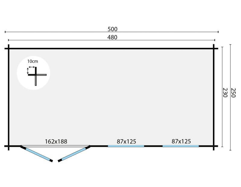 Das Gartenhaus Justine Wandstärke 40 mm in Fichtenholz gehobelt, unbehandelt. Blockbohlen Bausatz von 480 x 230 cm. Beachten Sie auch die erstklassige Firsthöhe von 243 cm , mit Boden