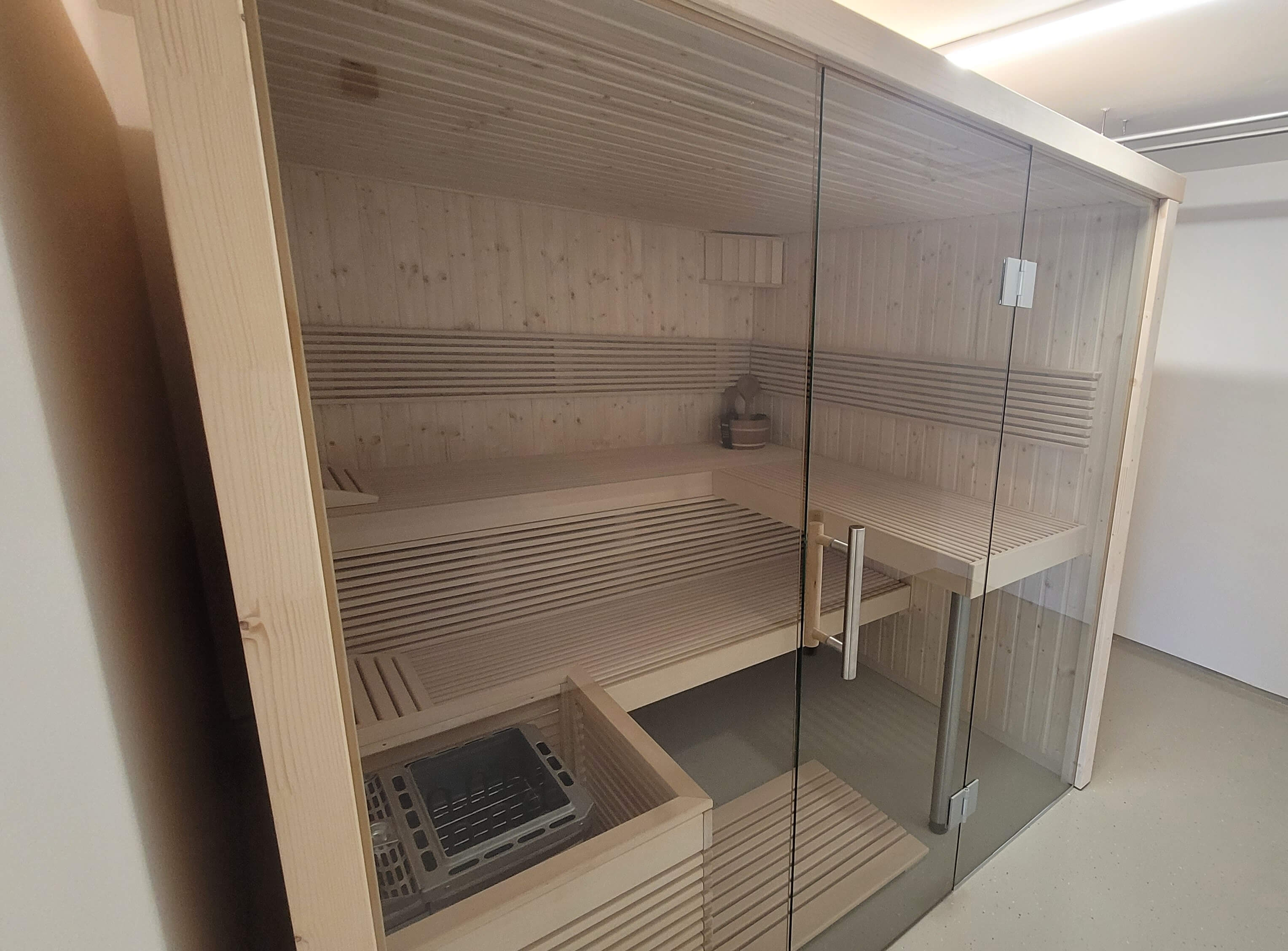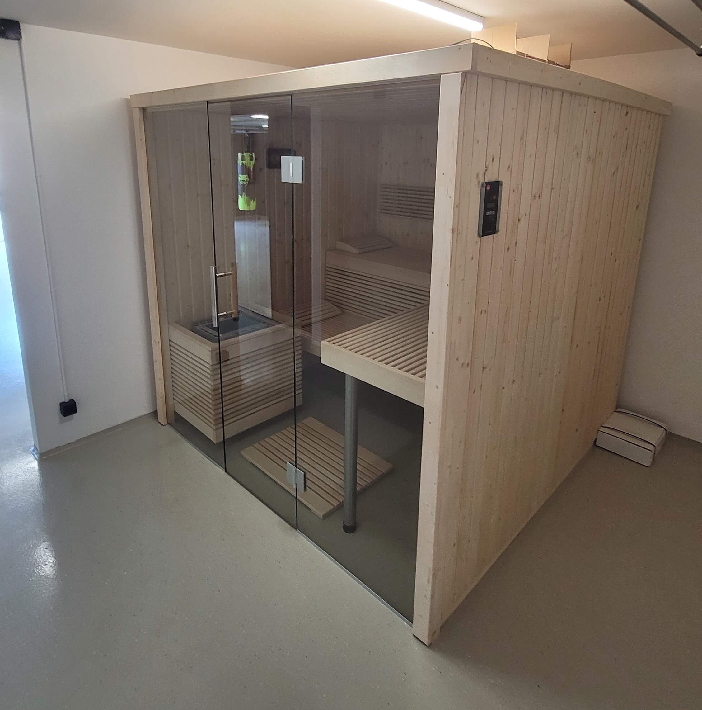 - Harvia 9 kW mit Aussensteuerung, geeignet für 400 Volt (3 x 16 Ampere). Aufpreis: CHF 200.-