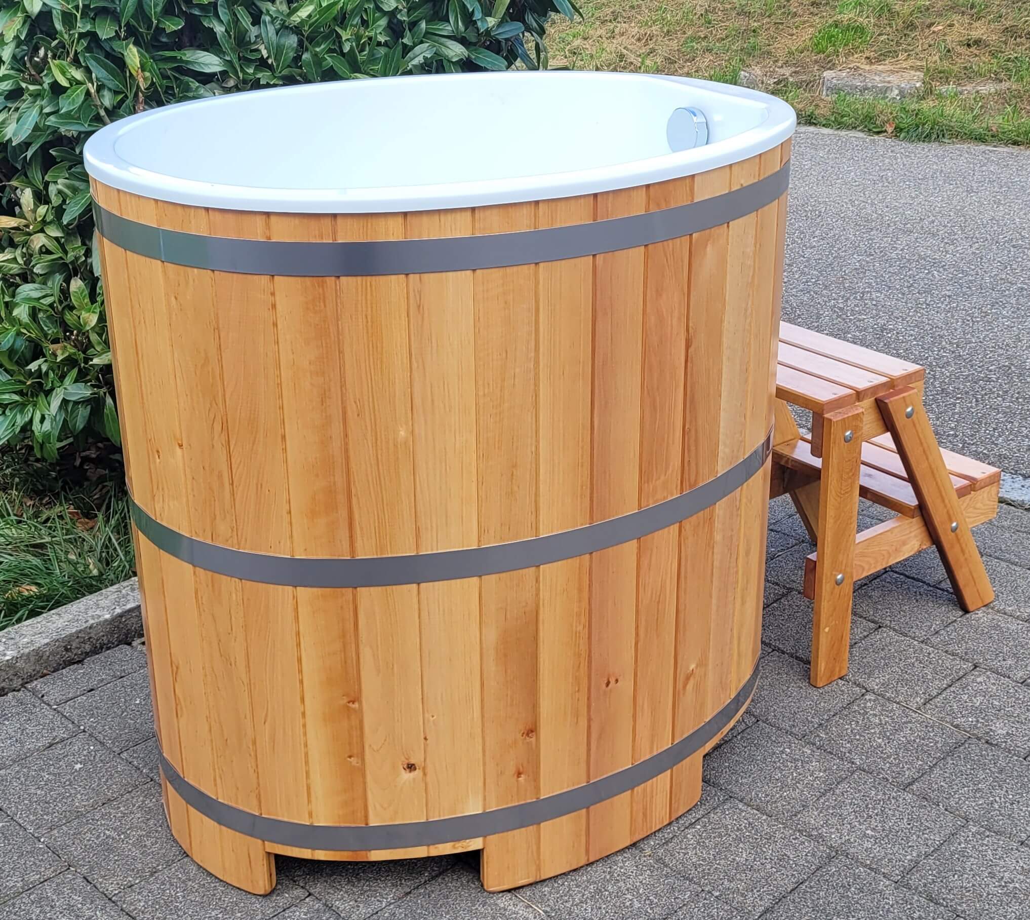 Sauna-Tauchbottich aus Zedernholz | Mit Chromstahlbändern und Einstiegstreppe, 110 × 75 cm