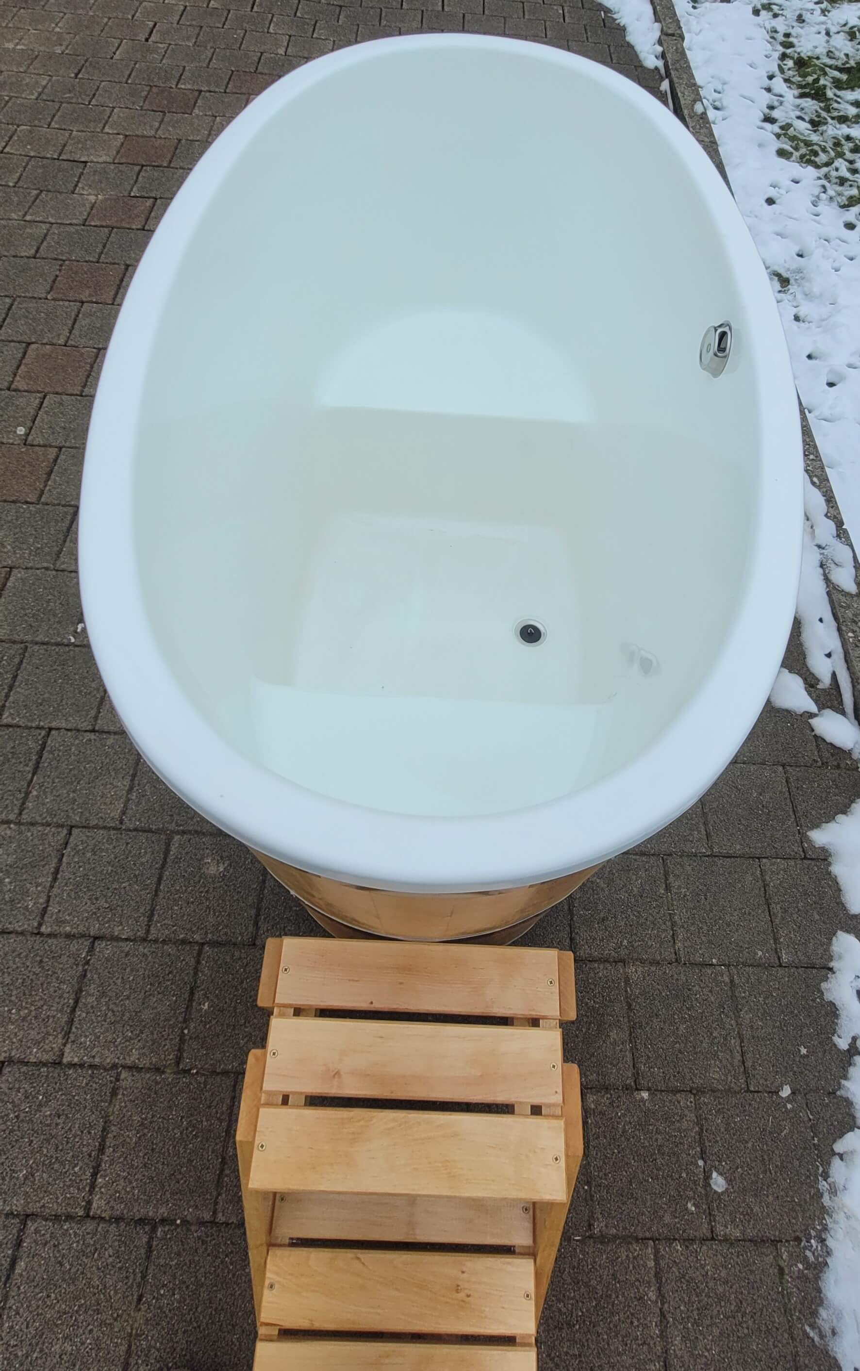 Das weisse Innenbecken ist aus Kunststoff gefertigt, 2 – 3 mm stark – dasselbe Material, das auch für Duschtassen verwendet wird. So bleibt die Oberfläche glatt, hygienisch und lässt sich einfach reinigen.