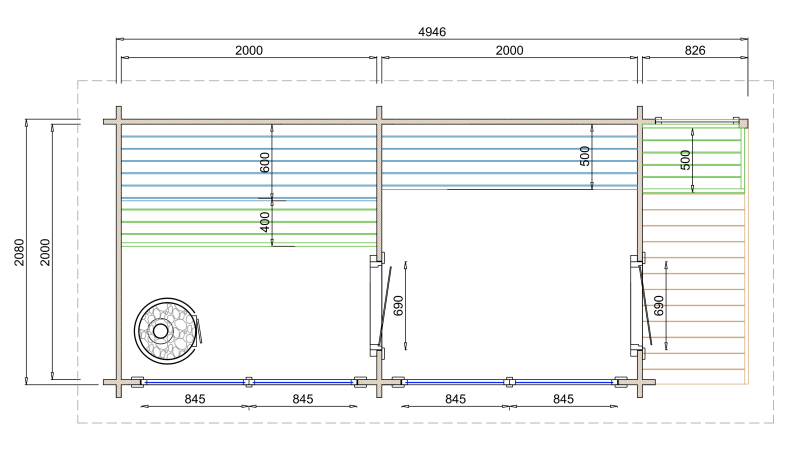 Saunaraum 200 cm + 100 cm Vorraum 1 kleine Sitzbank 50 x 100 cm + 82 cm Vordach